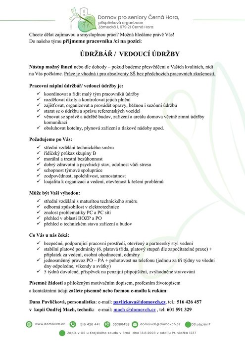 Úvod > O nás > Aktuality > Volné pracovní místo - údržbář/vedoucí údržby